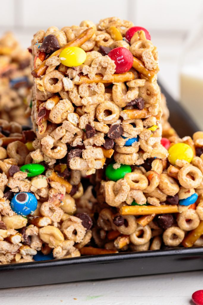 - Line a baking pan with parchment paper or lightly grease a prepared pan. In a large bowl, combine cheerios, peanuts, M&M’s, and broken pretzel sticks. Do not add chocolate chips yet.
